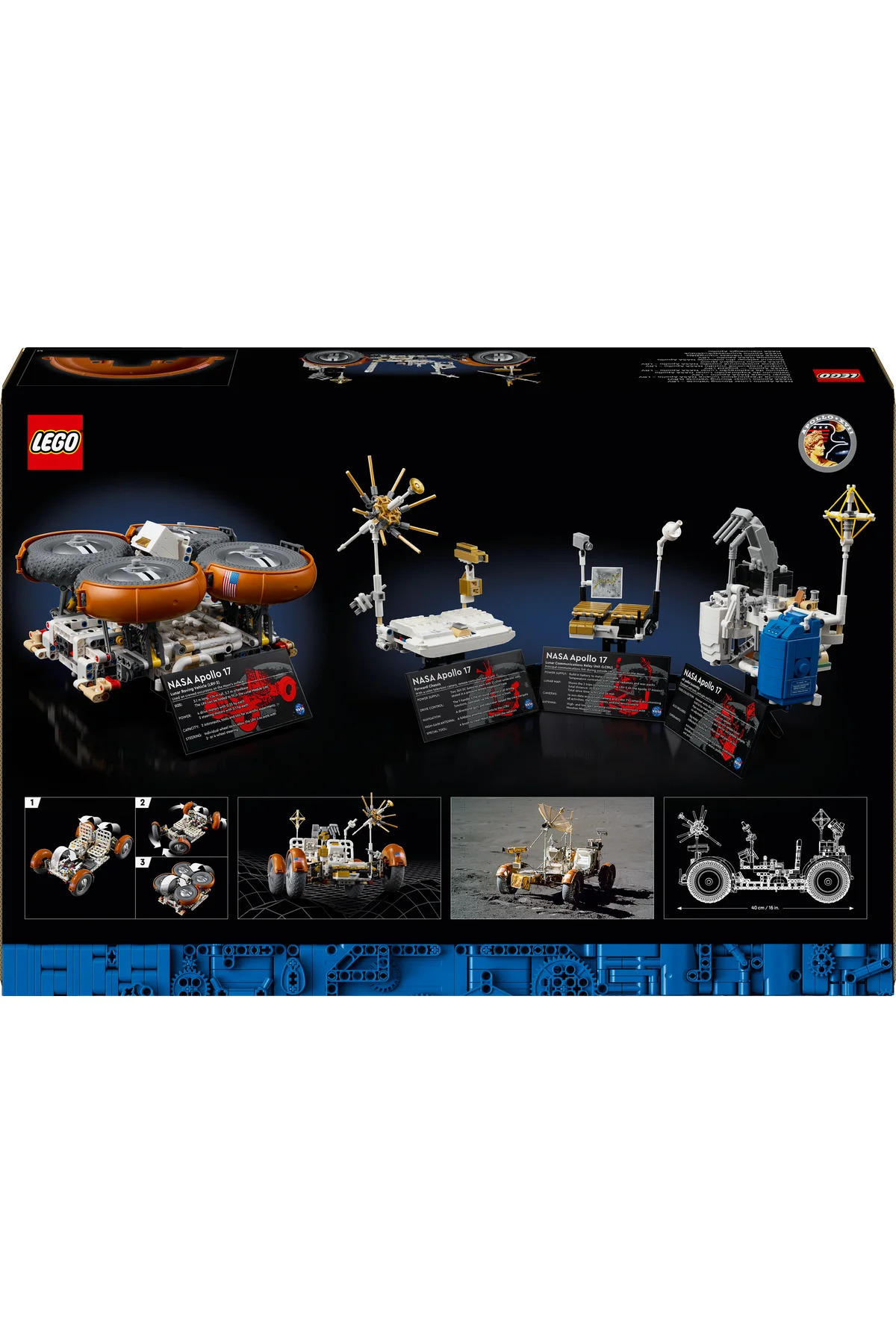 - با ست دقیق LEGO® Technic ناسا Apollo LRV 42182 سفری به ماه را بازسازی کنید؛ این مدل نمایشپذیر ماهنورد، جزئیات واقعی و ساختاری را برای تجربهٔ ساختی پیشرفته به شما ارائه میدهد.