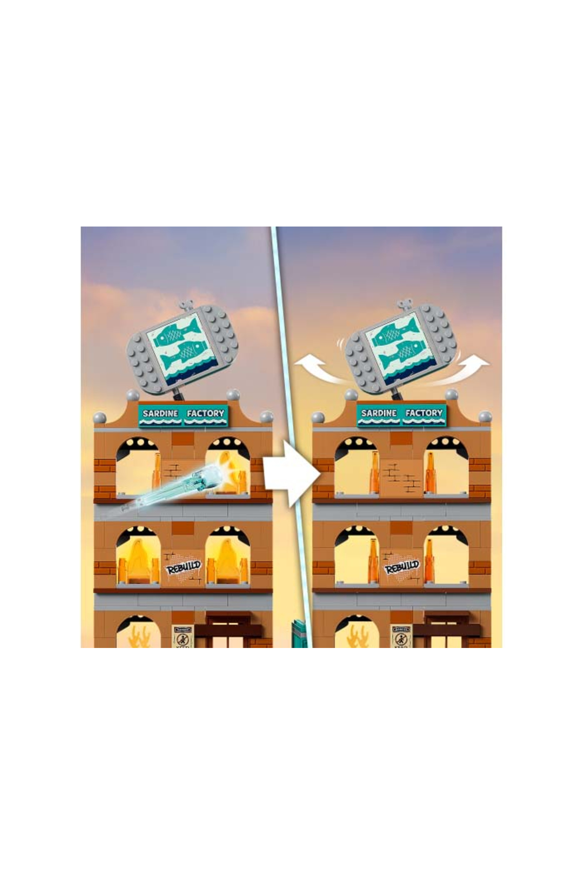 - مناسب برای کودکان 7 سال به بالا؛ شامل یک کارخانه کنسرو ساردین سهطبقه با شعلههای قابل تا شدن و مخزن «سس مخفی»، همچنین کامیون آتشنشانی با تریلر که قطعات آب را پرتاب میکند، موتورسیکلت آتشنشانی و وانت فرمانده آتشنشانی.
