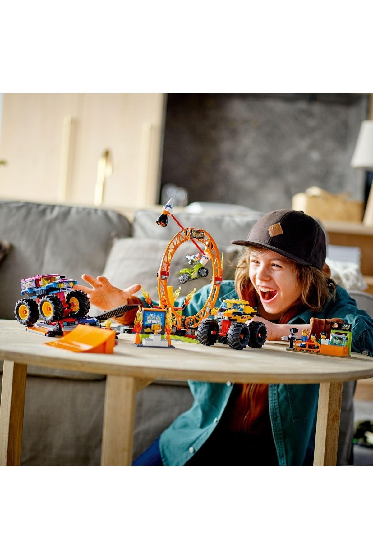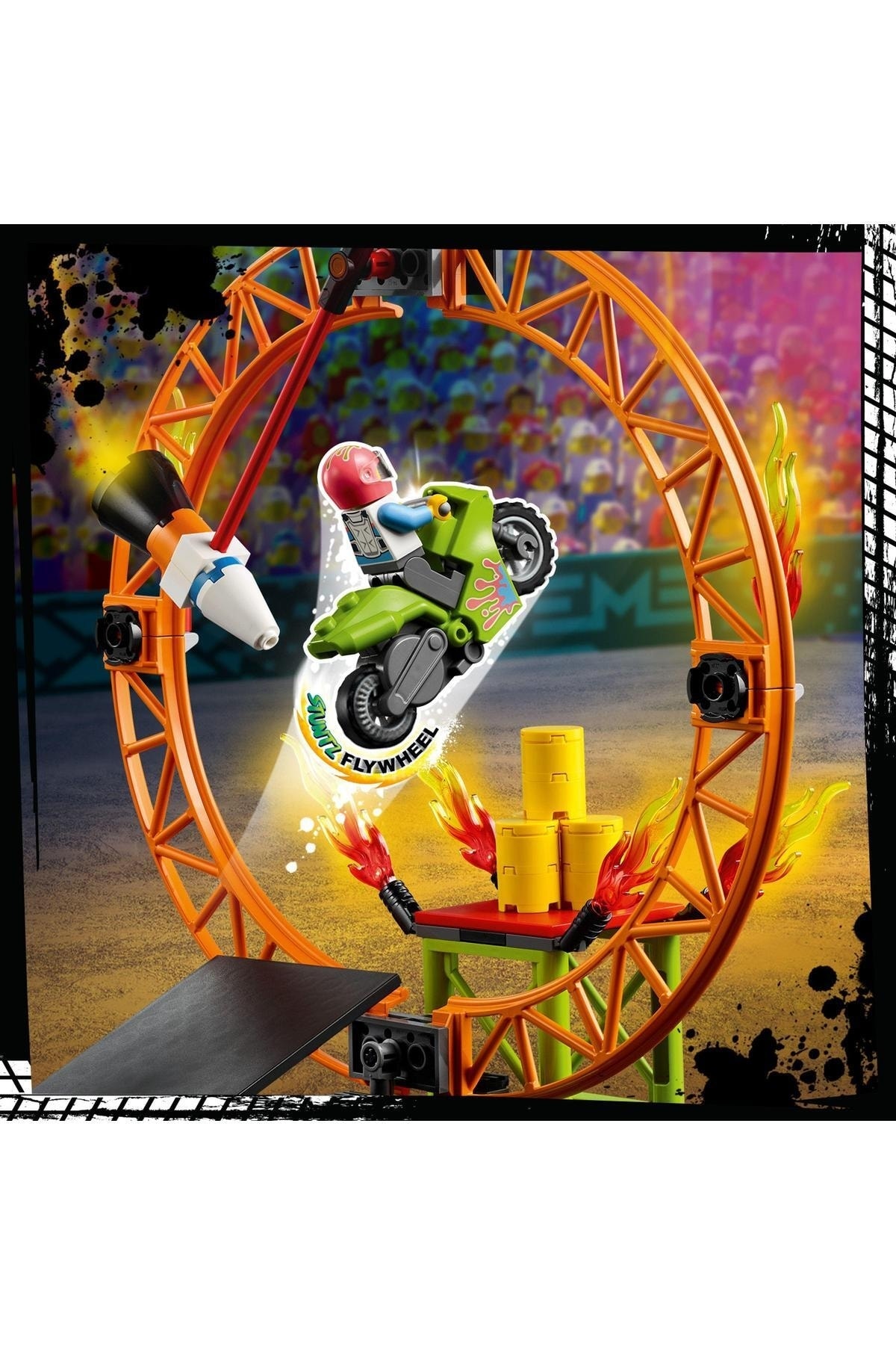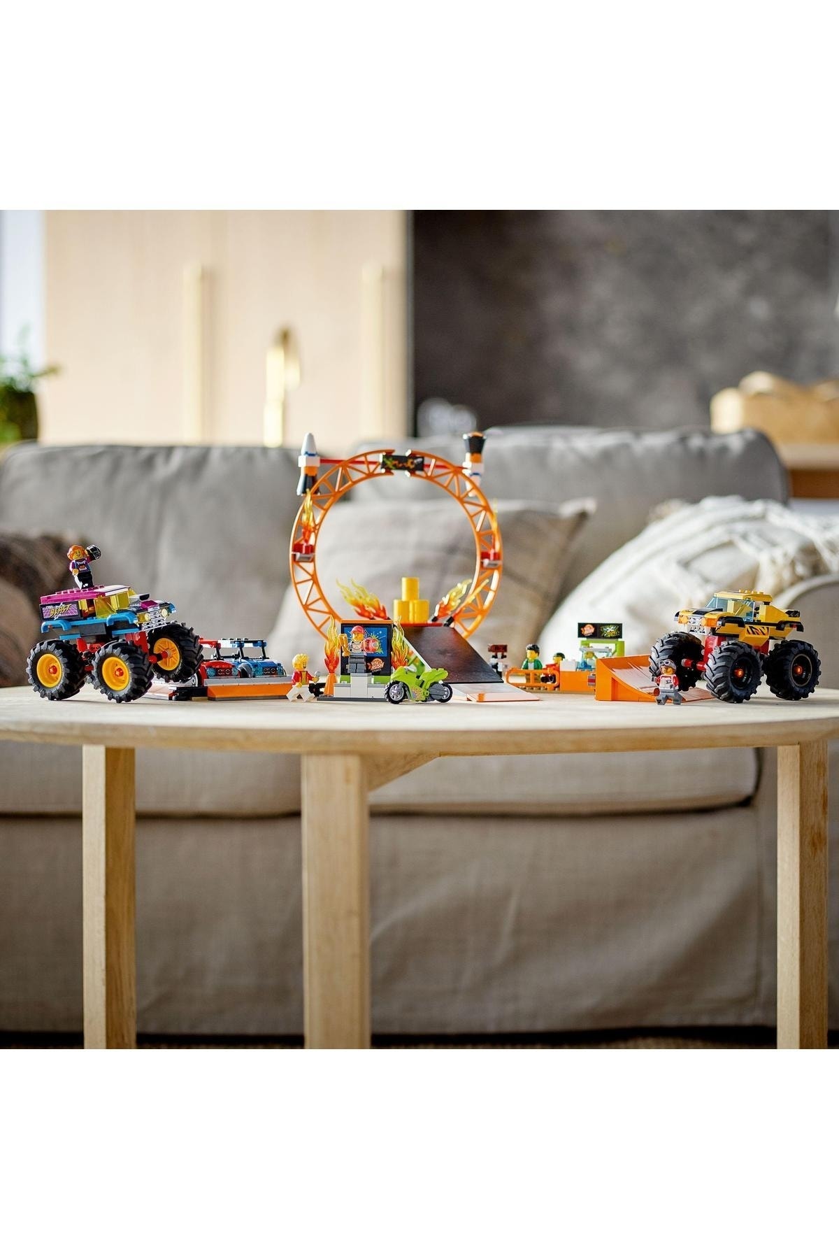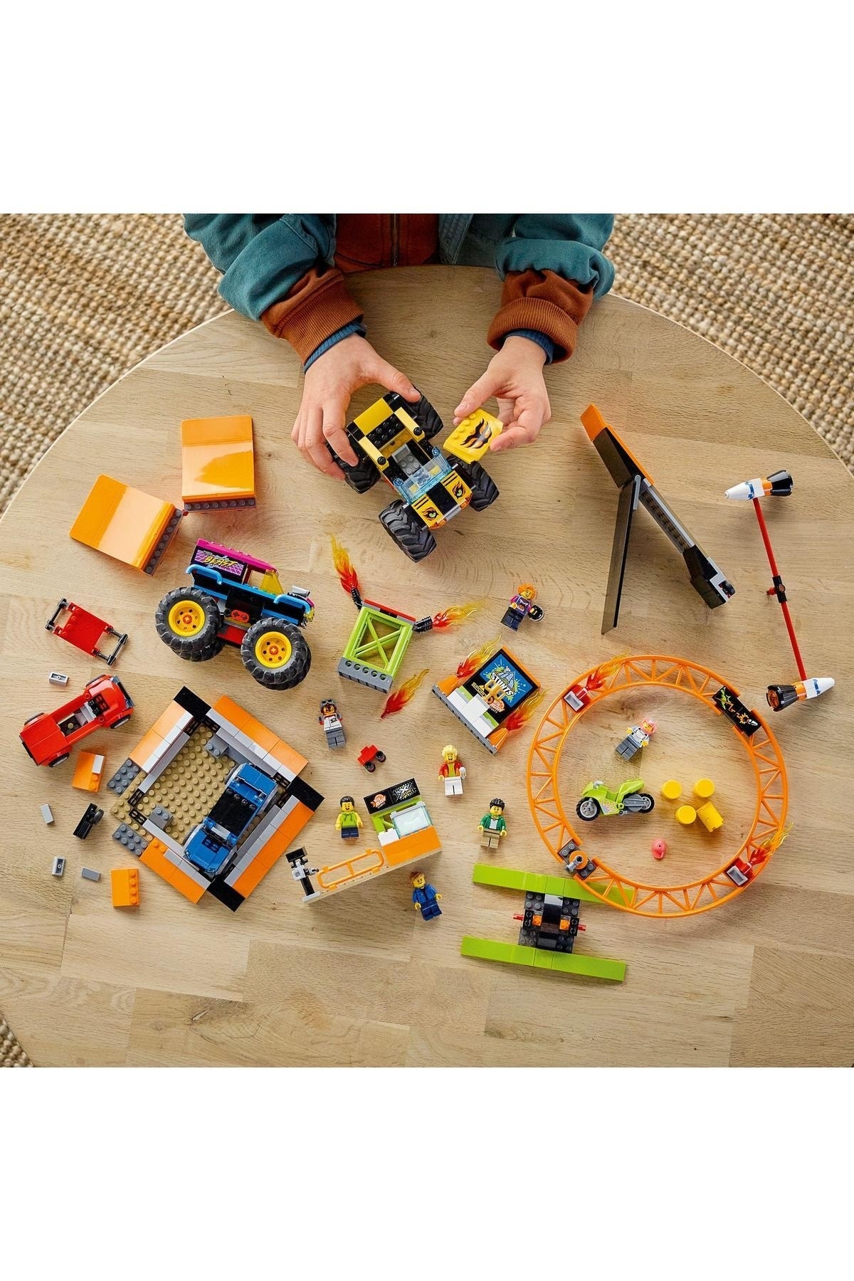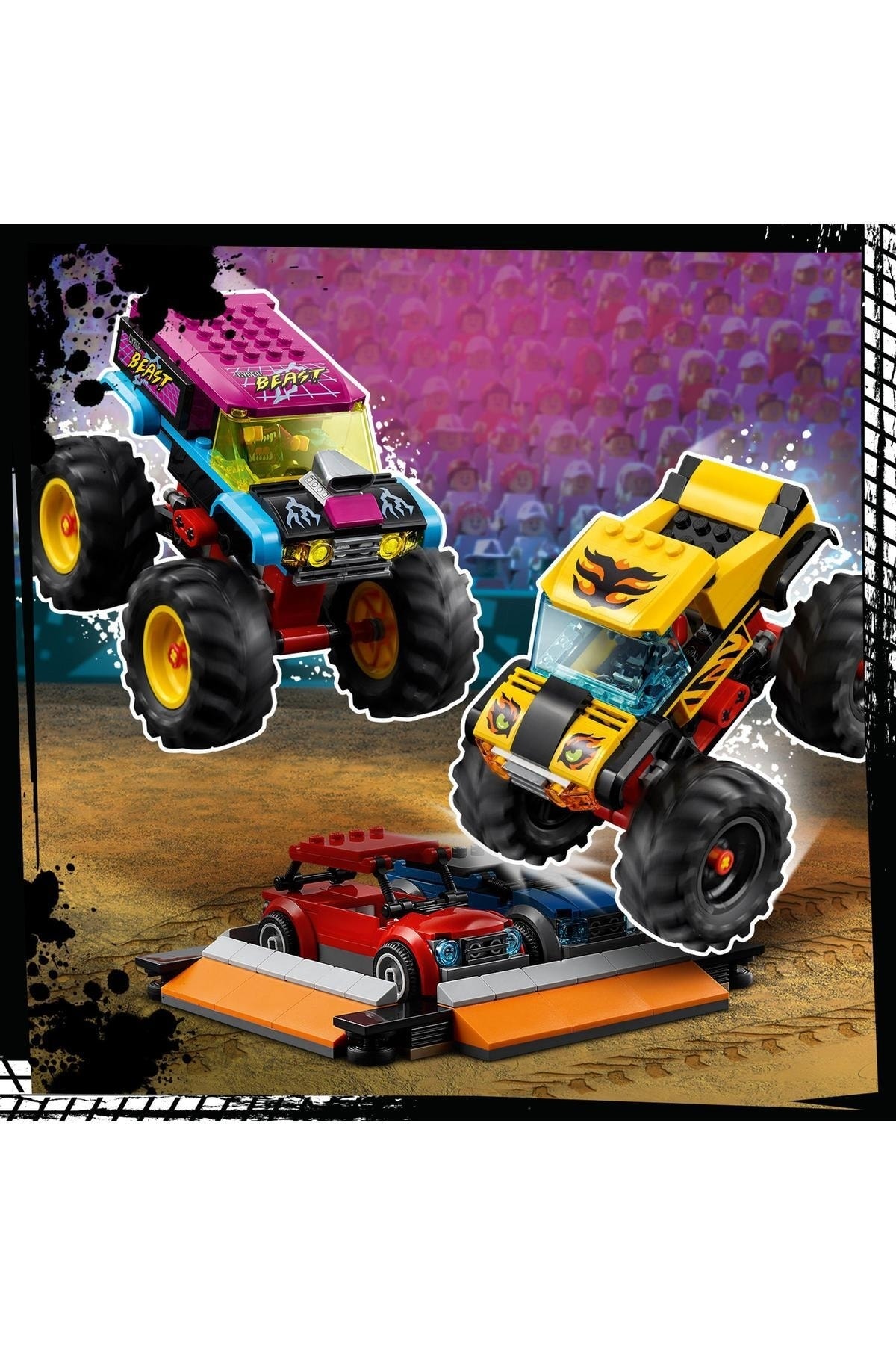 - در جعبه چه هست؟ همه چیزِ لازم برای ساخت 2 کامیون هیولا، 2 خودروی تاشو، یک حلقهی آتش، رمپهای پرتاب، موتور نمایش با فرمانمحور، غرفهی ساندویچ هاتداگ، سکوی نمایش، 6 مینیفیگ و قطعات بیشتر فراهم است.