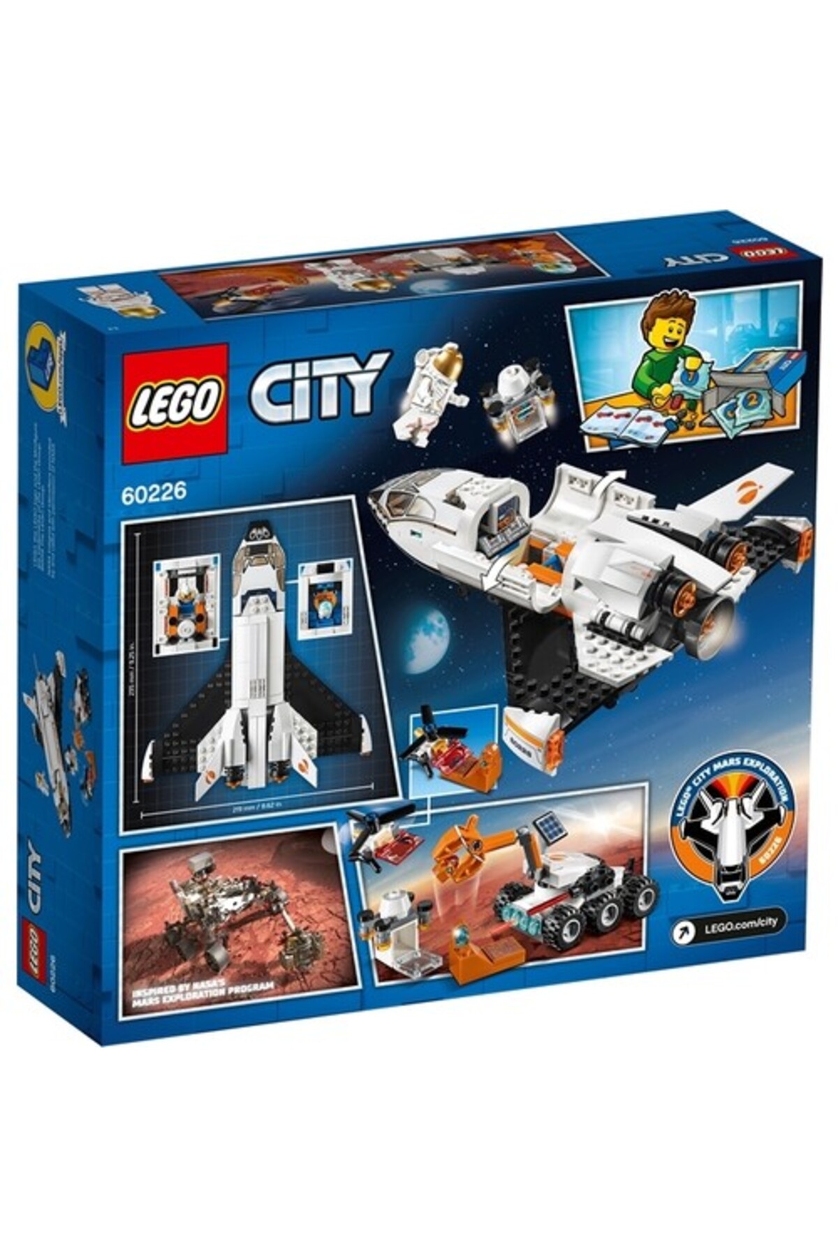 - لگو سیتی 60226 سفینه تحقیقاتی مریخ — با این ست بازی سفینه پژوهشی و خودروی کاوشگر، کودکان به بازیهای فضایی و فعالیتهای علمی الهام میگیرند.