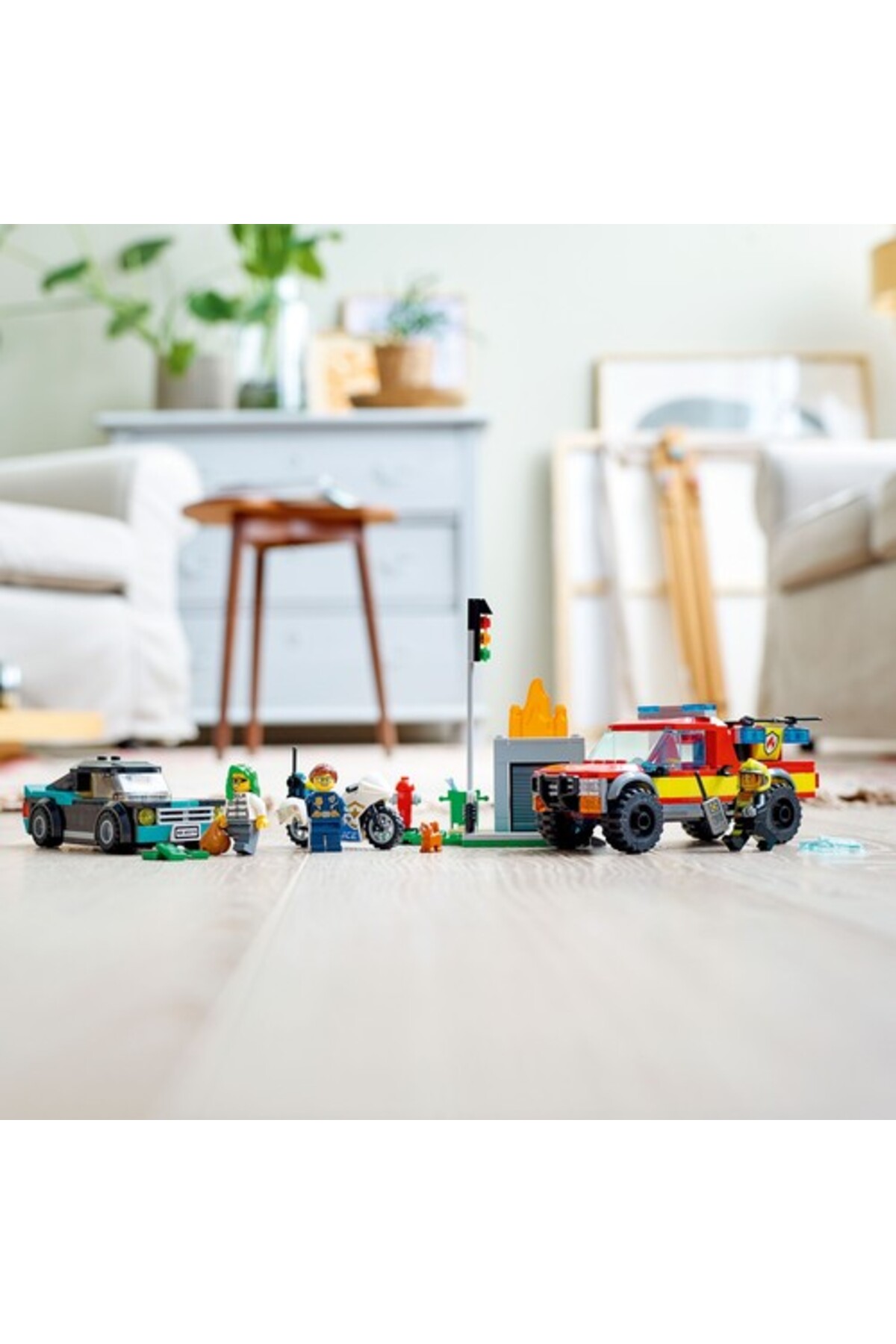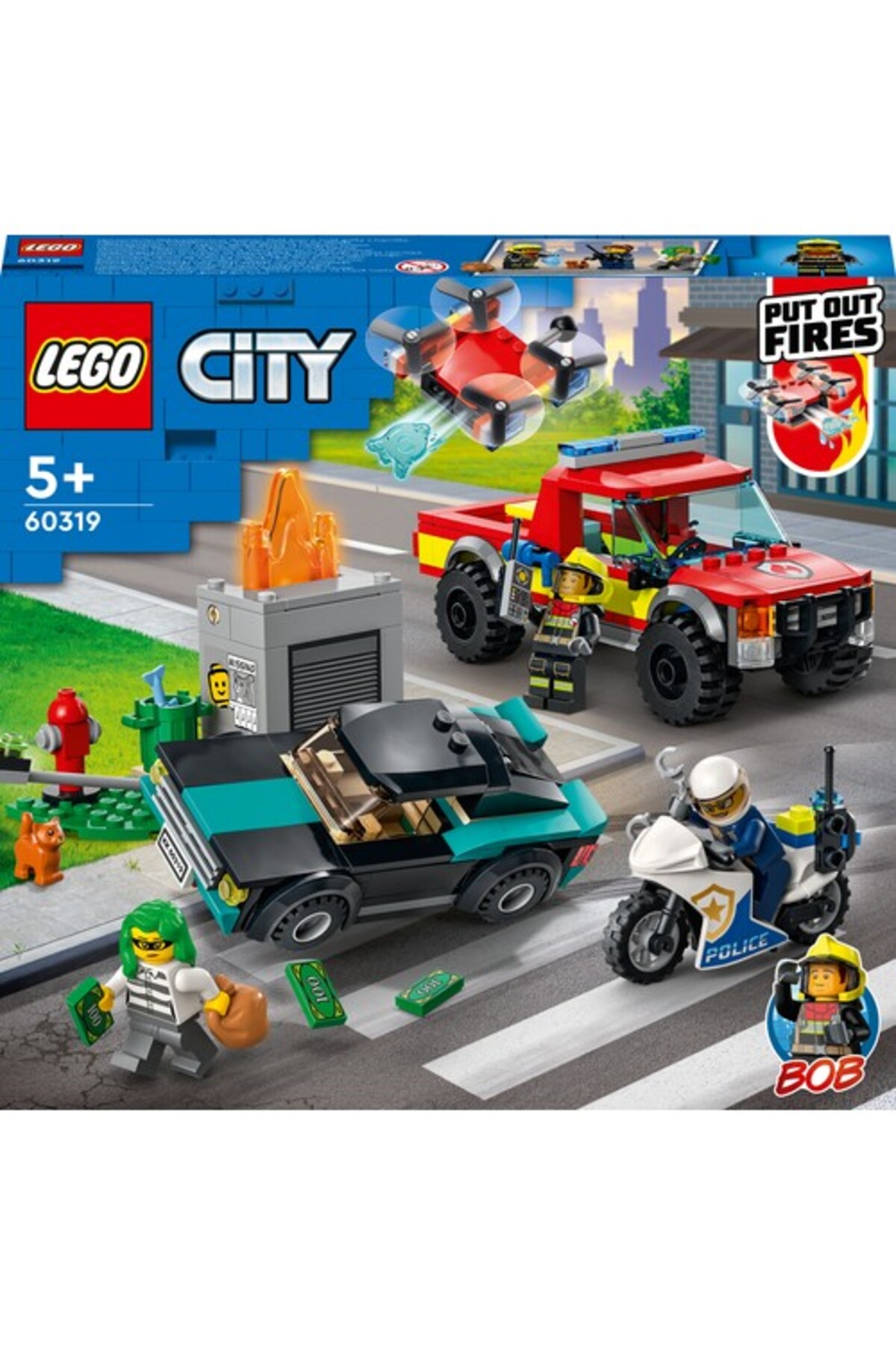 - ویژگیها: مناسب کودکان 5 سال و بالاتر — محتوای جعبه شامل کامیون آتشنشانی مجهز به پهپاد، موتورسیکلت پلیس، خودروی فرار سارقها، صحنه آتش با چراغ راهنمایی، فیگور گربه و 3 مینیفیگور (شامل آتشنشان باب). امکانات: پرتاب قطعات آب LEGO از پهپاد، واژگون کردن چراغ راهنمایی و قابلیت بالا و پایین بردن شعلههای LEGO در صحنه آتش. هدیهای مناسب برای تولد یا هر مناسبت دیگر. ابعاد نمونهٔ کامیون آتشنشانی داخل ست: ارتفاع 6 سانتیمتر، طول 16 سانتیمتر، عرض 7 سانتیمتر.