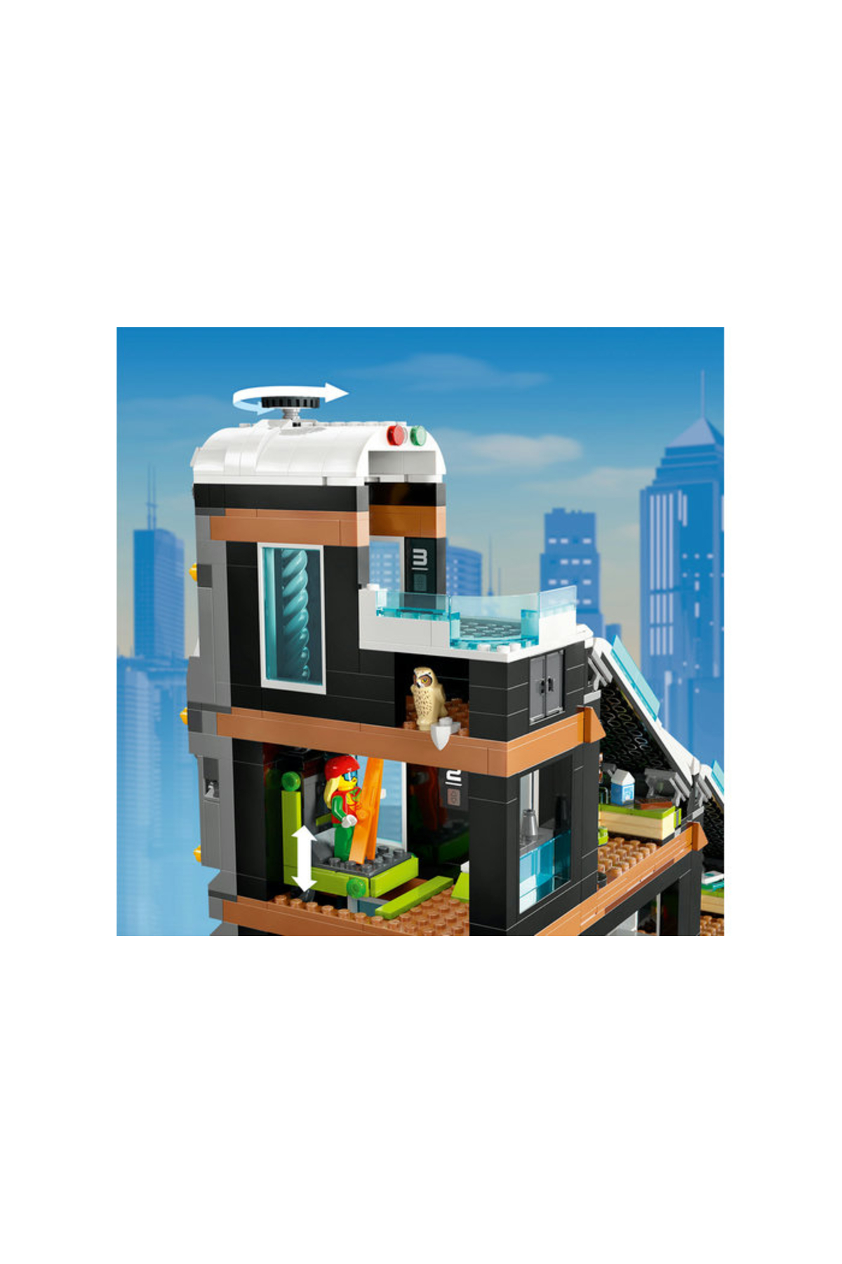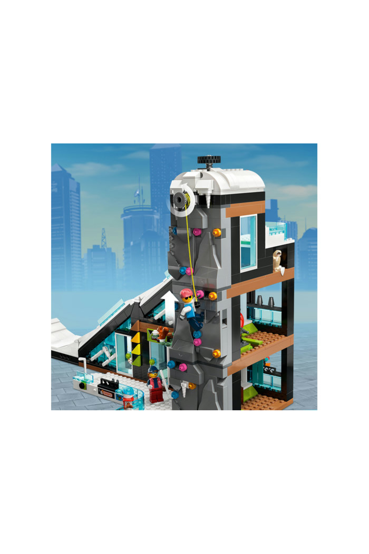 - داخل جعبه: همهٔ قطعات لازم برای ساخت یک ساختمان مدولار سهطبقه شامل فروشگاه ورزشهای زمستانی، کافه و پیست، بهعلاوه 8 مینیفیگور با لوازم اسکی، آدمبرفی، جغد و سنجاب.