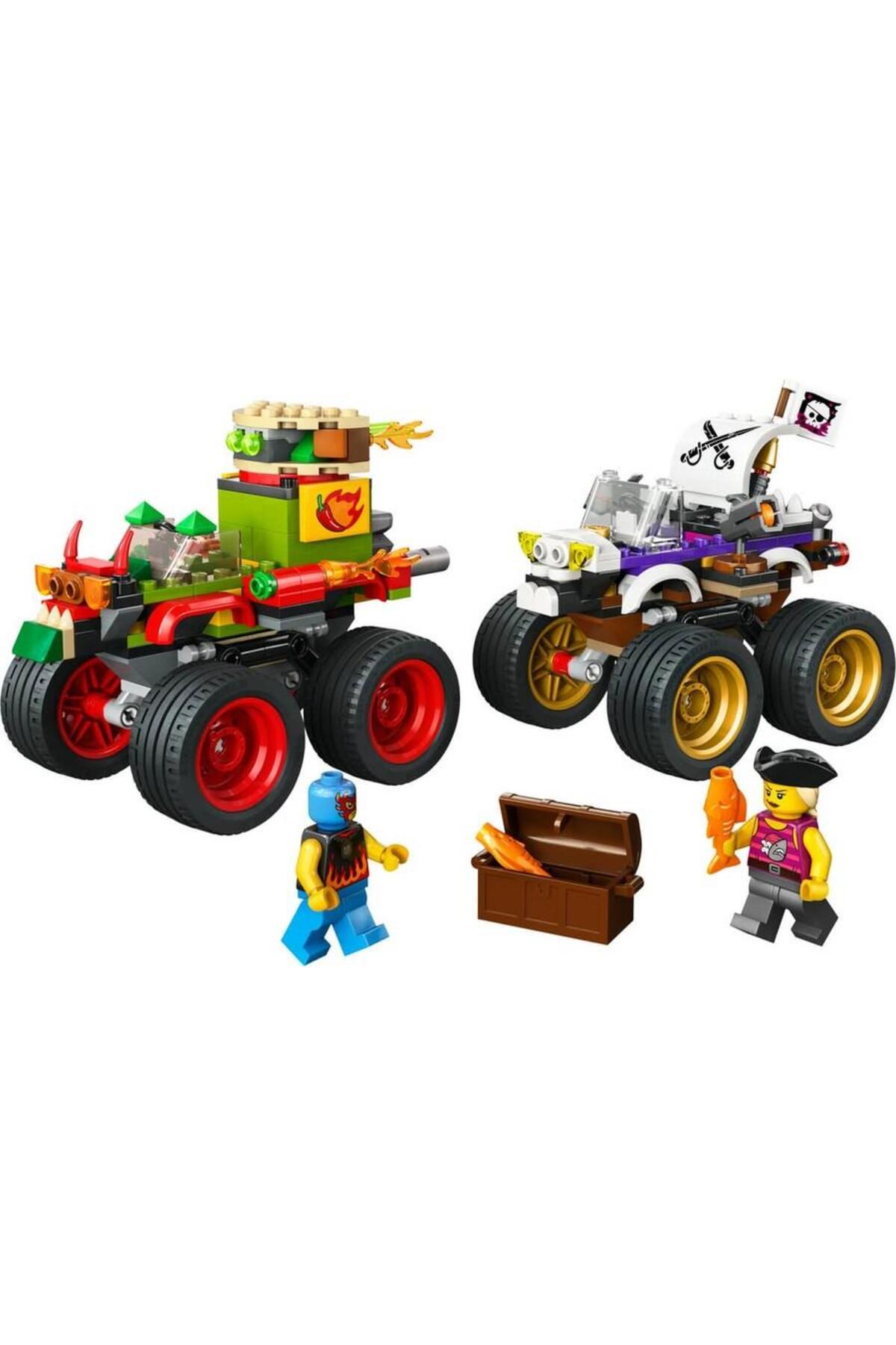 - در جعبه چه چیزی هست؟ — شامل کامیونهای هیولای با تم تاکو و تم دزد دریایی همانند بازی LEGO® 2KDRIVE و همه قطعات لازم برای ساخت 2 مینیفیگور راننده.