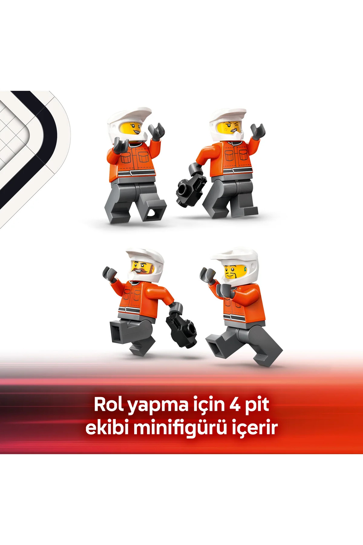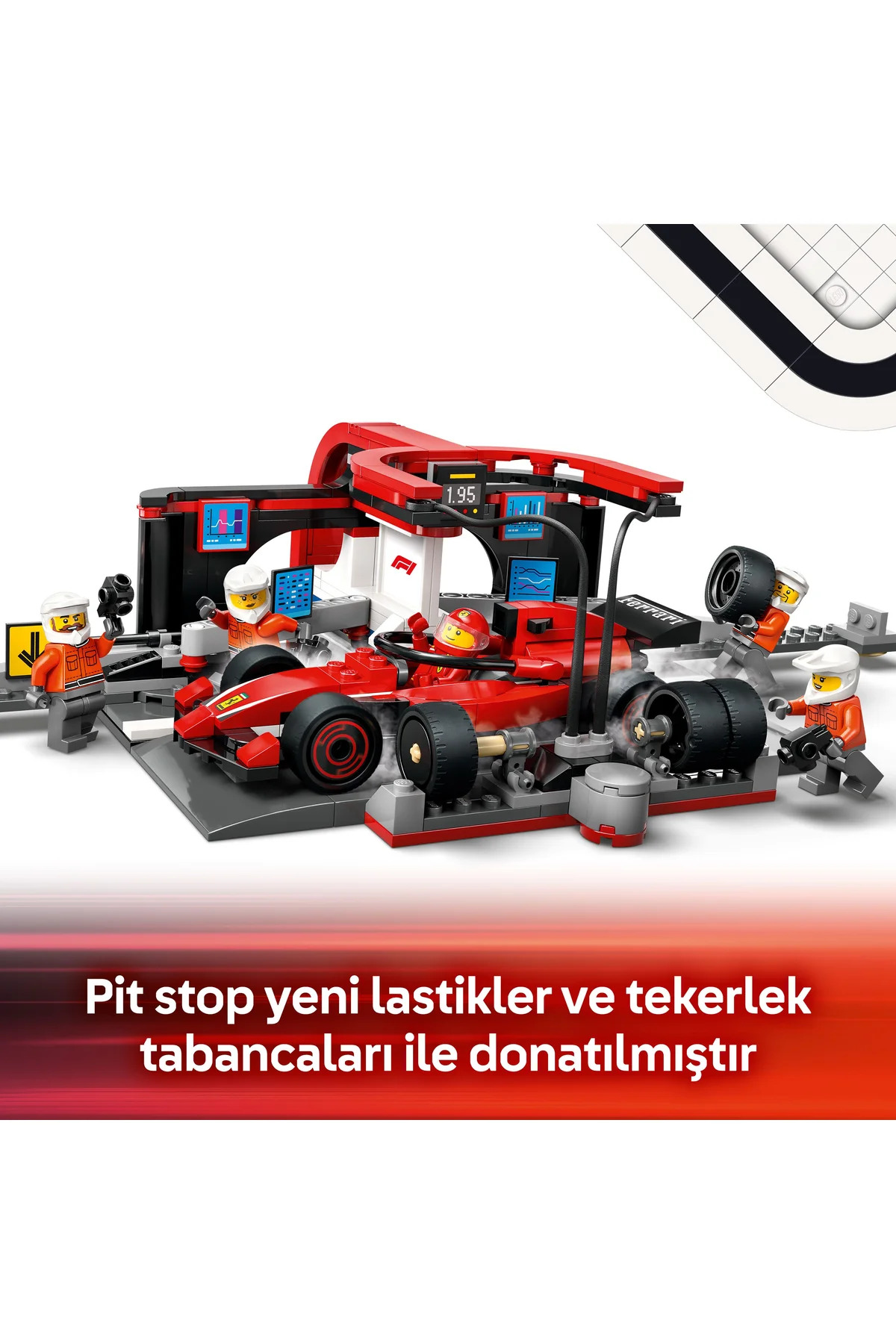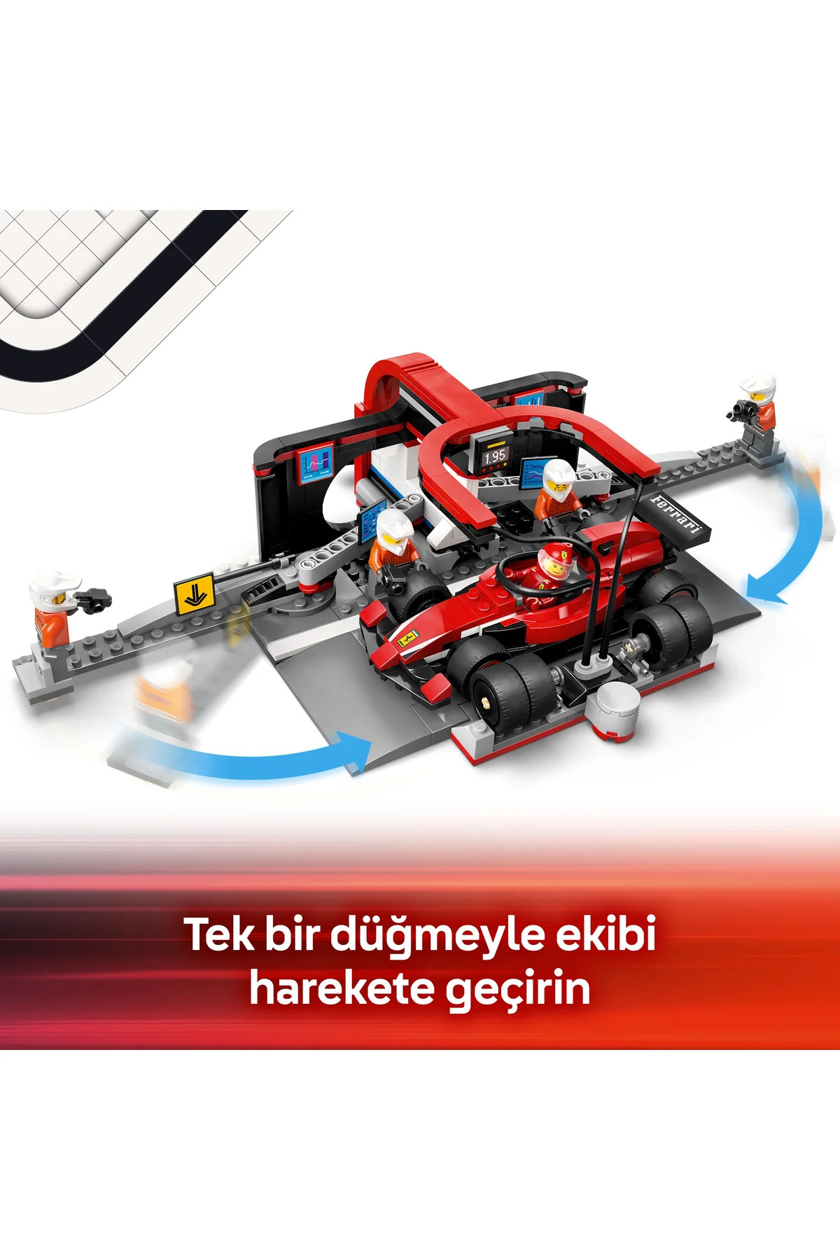 - مشخصات کلیدی: این مجموعه شامل خودروی مسابقهای فراری فرمول 1، راننده و 4 مینیفیگ تیم پیت، لاستیکهای مخصوص، دستگاههای باز/بست مهره و ابزار لازم برای تعویض سریع تایرهاست تا پیتاستاپهای سریع و واقعگرایانه شبیهسازی شود.